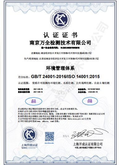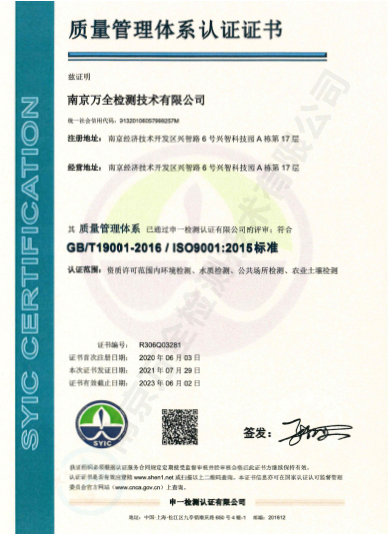 南京萬全檢測技術有限公司,籌建于2013年1月,注冊資金500萬,公司坐落于南京經濟技術開發(fā)區興智路6號興智科技園A棟17層,實驗室占地面積1750余平米。公司是一家獲得省級CMA計量認證資質、具有獨立法人、政府認可的綜合性、專業(yè)性的檢測機構。環(huán)境監(jiān)測業(yè)務是其重要的檢測業(yè)務之一,目前已獲得省級計量資格認可項目314項,設備齊全,具有較強的技術能力。